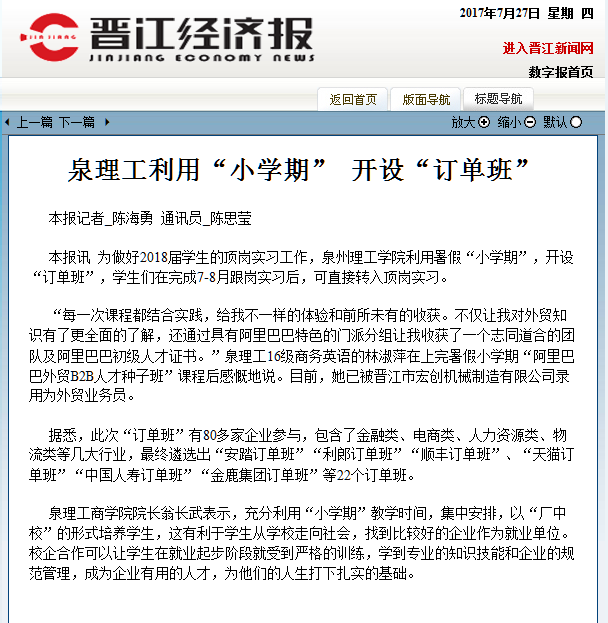 【晋江经济报】泉理工利用“小学期” 开设“订单班”