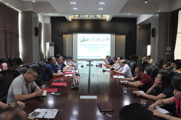 会议现场 签订仪式 6 月15日,泉州理工学院举行2016年综治安全目标管理责任书签订仪式。全校各部门签订责任书,将校园安全责任落实到各自部门中去,明确责任,重点狠抓,并实现“党政同责,一岗双责”的...