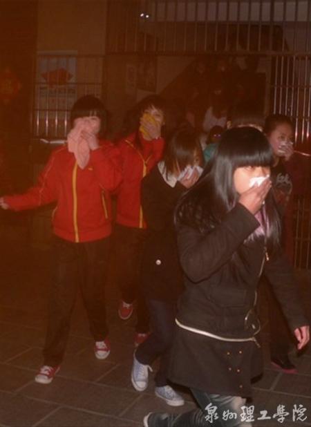 学生用湿毛巾捂住口鼻疏散 罗志凌 摄 应急疏散后集合清点人数 黄其斌 摄 学生在校卫队的指导下使用灭火器 许奕梅 摄 3月 28日晚,泉州理工学院思恩楼内浓烟四起,警铃大...