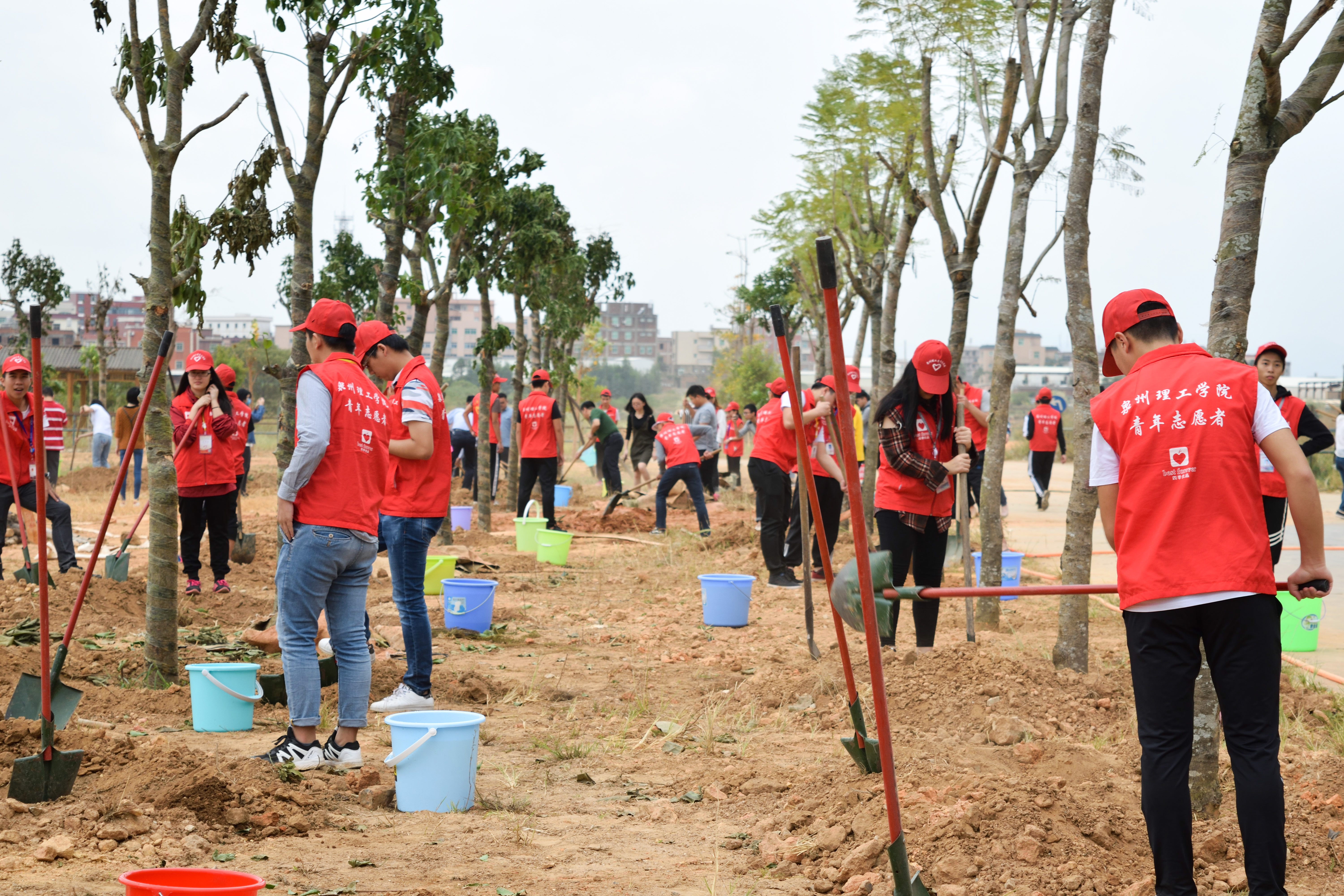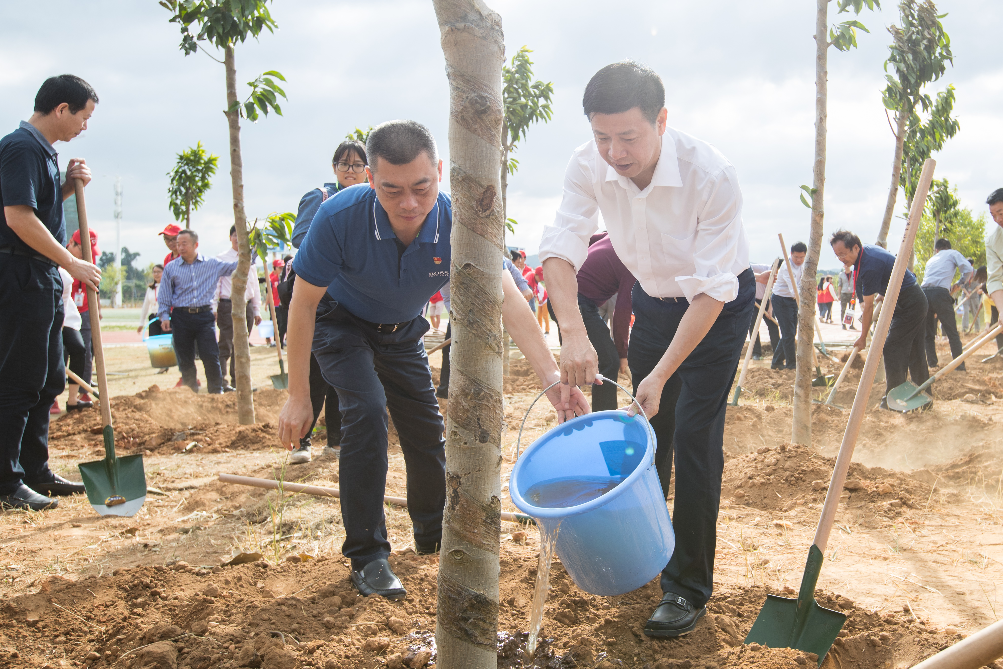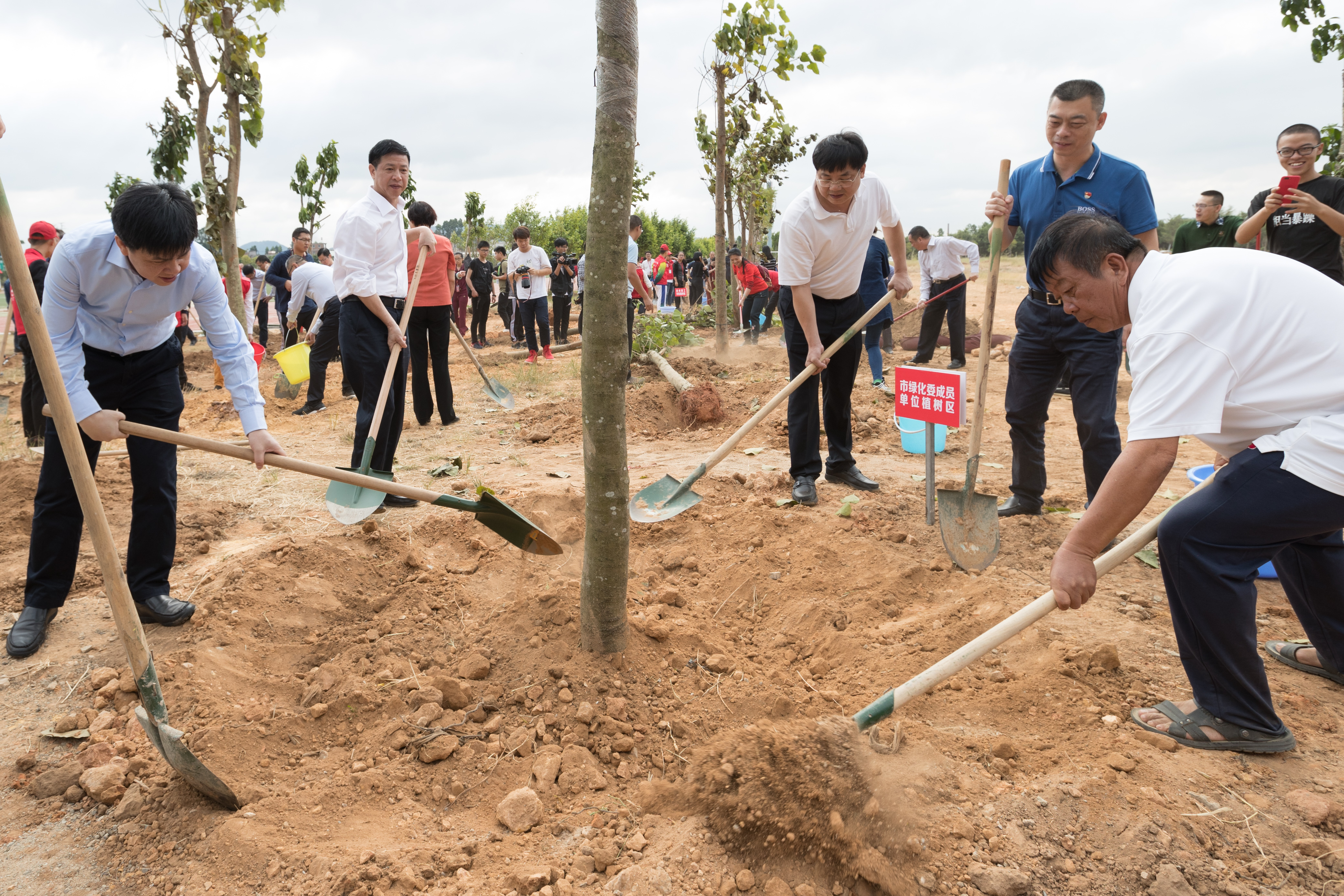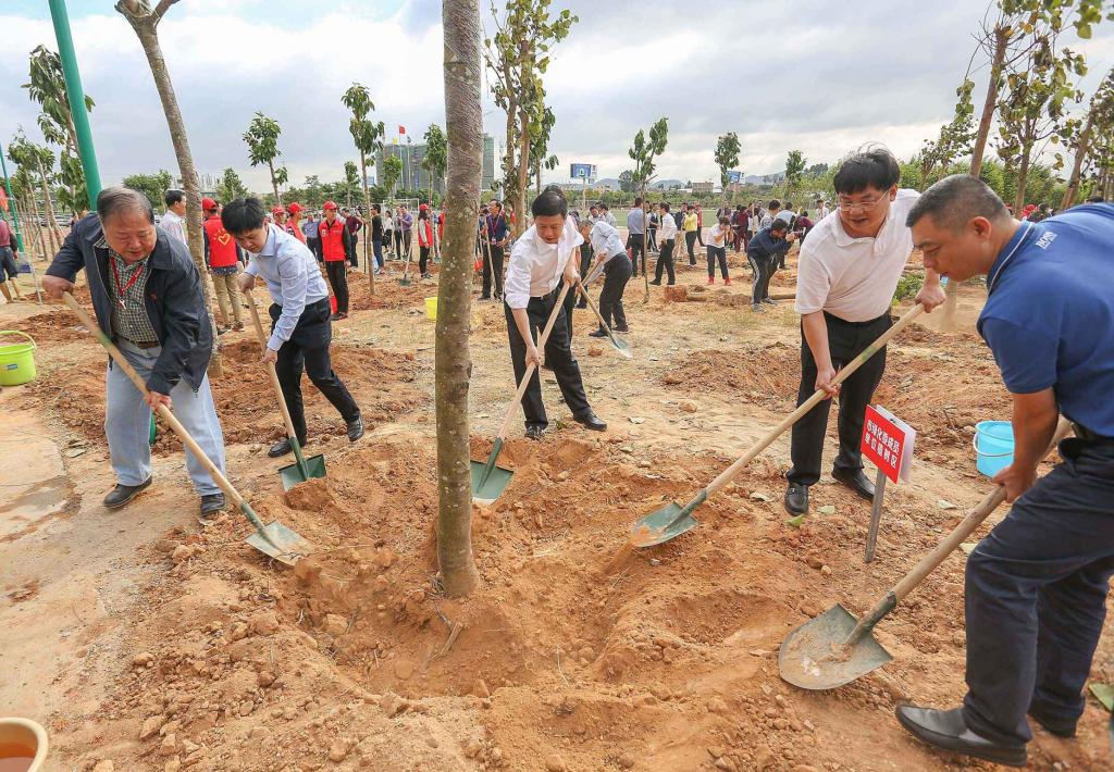 植树现场,绿潮涌动,市领导、干部群众、师生代表三人一组、五人一群,300多人撸起袖子,人手一把铲子,铲土回填、培土栽植、制作树穴、提水浇透……大家有条不紊,种下355株菩提、白兰花、蓝花楹、秋枫等树种,掀起一轮造林绿化热潮。