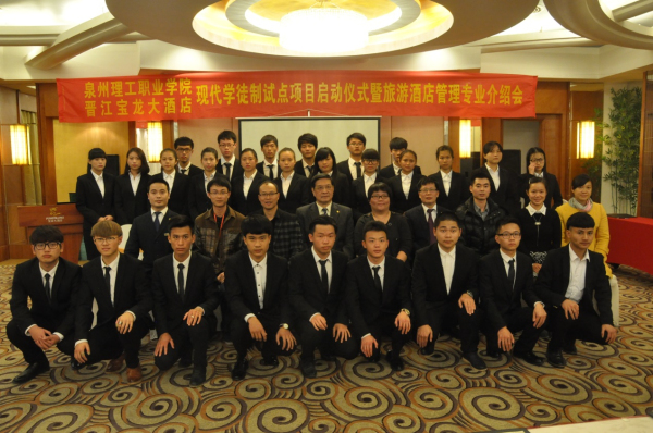 2015 年12月9日下午2时30分,泉理工学院、晋江宝龙大酒店 “现代学徒制”试点项目启动仪式暨酒店旅游管理专业介绍会在晋江宝龙大酒店召开。泉州理工学院副校长吴滨如、晋江宝龙大酒店副总经理谢俊民、商学院党总支书记陈荣惠、商学院管理系主任叶城锋及我校部分专业教师出席参加活动。