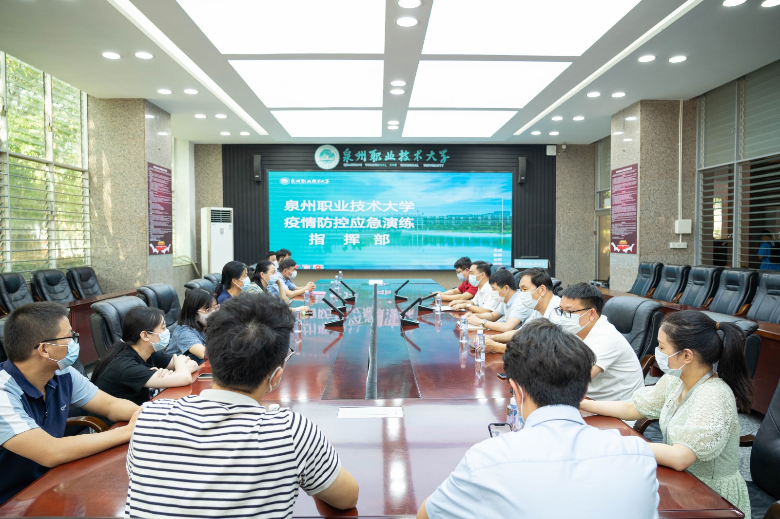 泉州市高教发展中心副主任李冬英、晋江市疾控中心主任助理林清爽等领导,与泉州市高教发展中心、晋江市疾控中心、晋江市公安局治安大队、晋江市应急管理局、内坑镇等单位相关工作人员,莅临疫情防控应急演练现场观摩演练。演练由我校党委书记傅志雄担任总指挥长,副校长郭霏霏担任常务副总指挥长,党委副书记、副校长蔡金佩,副校长庄文瑞,副校长林文艺担任副总指挥长,校疫情防控工作领导小组相关职能部门、师生员工和志愿者参加演练。