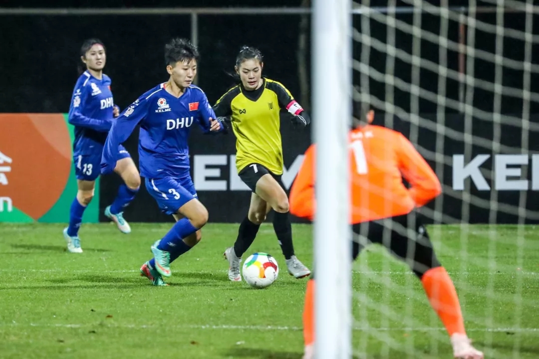 第5分钟,东华大学队16号球员尤丹丹带球走中路,在弧顶附近起脚远射,皮球打在对方球门横梁下沿后入网。东华大学队1:0,暂时领先。