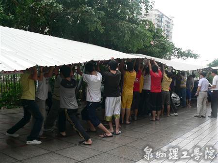 由于本次台风来势凶猛,降雨量大,导致学校部分广告牌被台风刮坏、车棚倒塌、部分树木被连根拔起、校园内严重积水、学校北渠道路堵塞。发现险情后,学校领导召开了自然灾害防御工作应急会议,成立抗灾领导小组,对学校的受灾情况进行全面巡查、评估,立即启动应急措施,组织力量进行灾后抢险和抢修工作。在校领导的带领下全校师生众志成城投入到紧张的抢修工作中