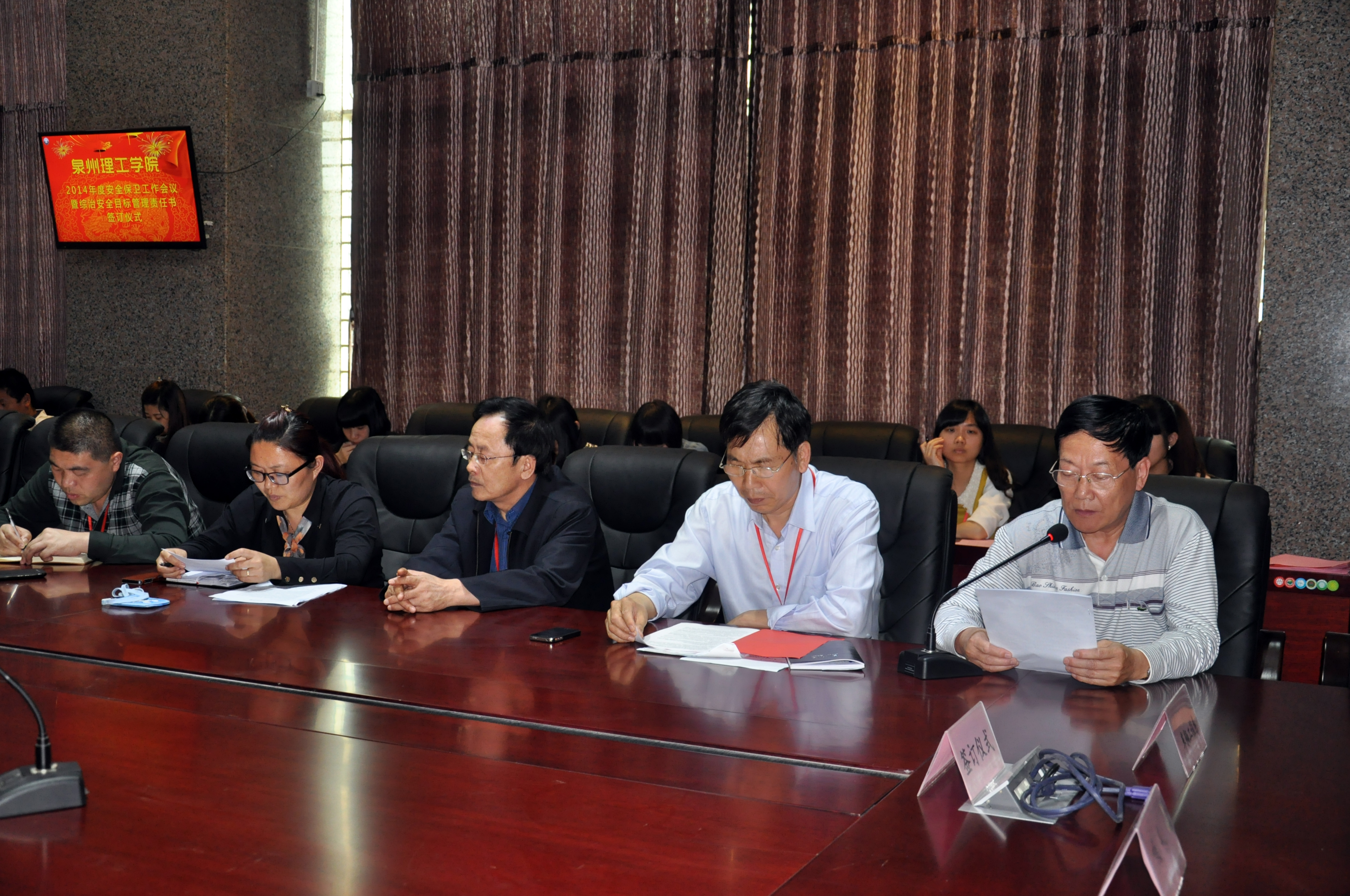 4月29日下午,我校2014年度安全保卫工作会议暨综治安全目标管理责任书签订仪式。出席签订仪式的有党委副书记黄志梅、副校长庄文瑞等领导以及相关各部门负责人。