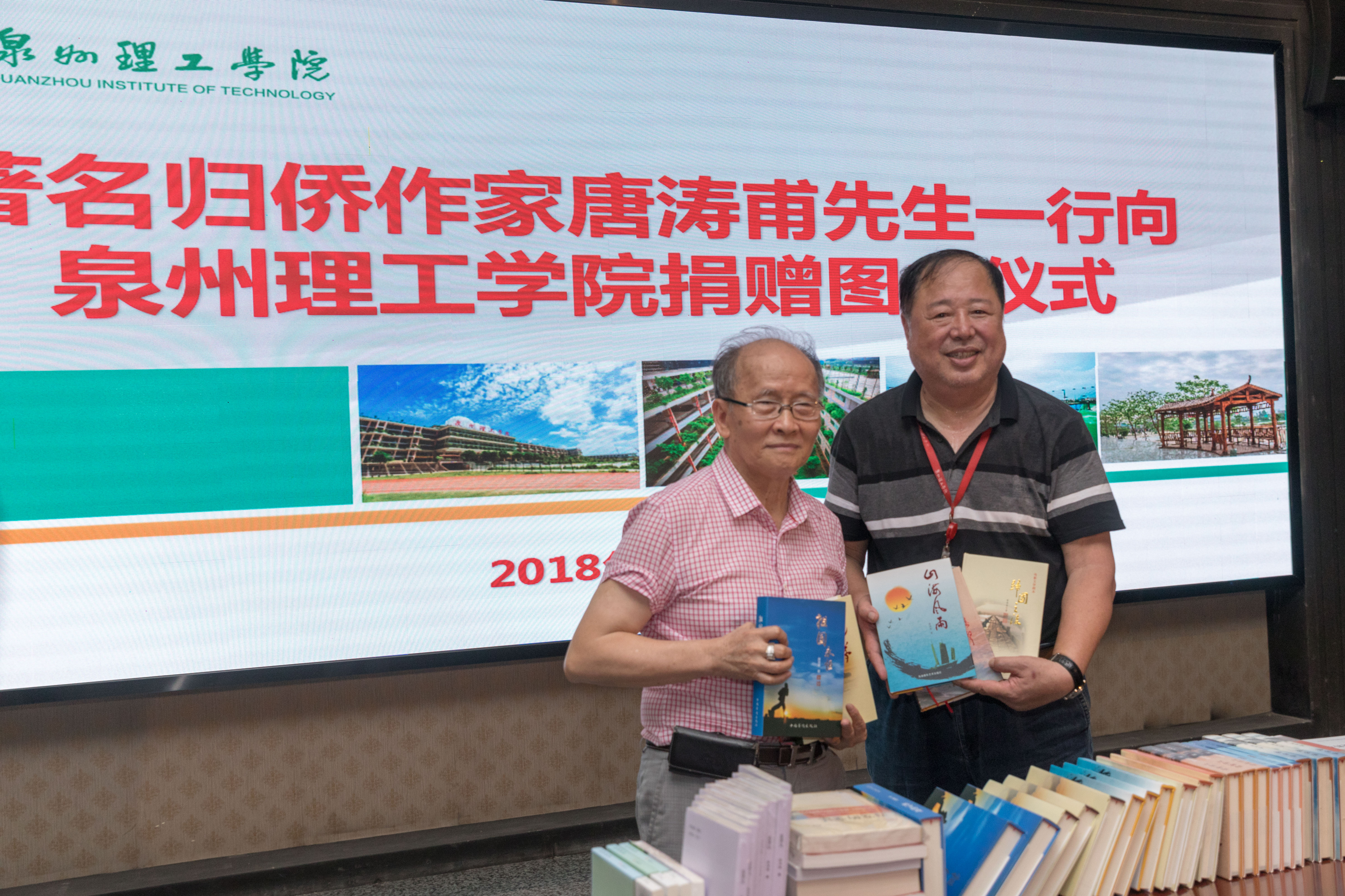 6月20日下午, 著名归侨作家、福建省作家协会、福建省法学学会会员唐涛甫先生带着他创作的七部书籍来到泉州理工学院,与师生畅谈创作心得。晋江电台台长尤振阳、福建省作家协会会员庄马炮、中国书法协会理事汪真谦等一行来校参加捐赠仪式。
