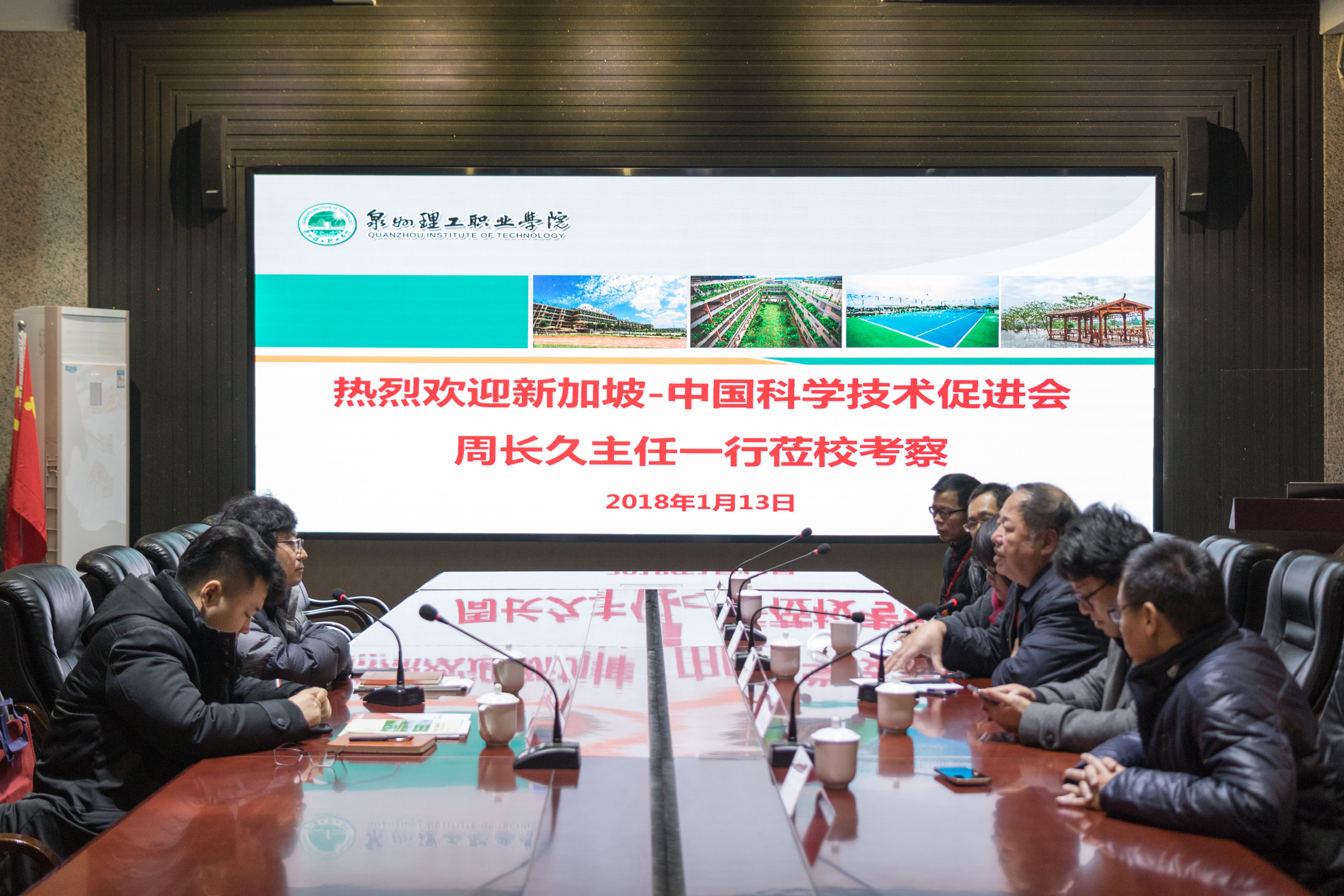 1月13日,新加坡--中国科学技术促进会周长久主任一行来校参观交流。我校校长臧树良、副校长吴滨如、校长助理郭霏霏等陪同交流。一行人首先参观了校史馆、数字媒体中心、绿色建筑展厅、智能制造中心等地,了解我校办学情况,周长久主任对我校“产业伙伴型大学”的办学特色印象深刻,学校与当地产业深度融合,校企合作协同创新。