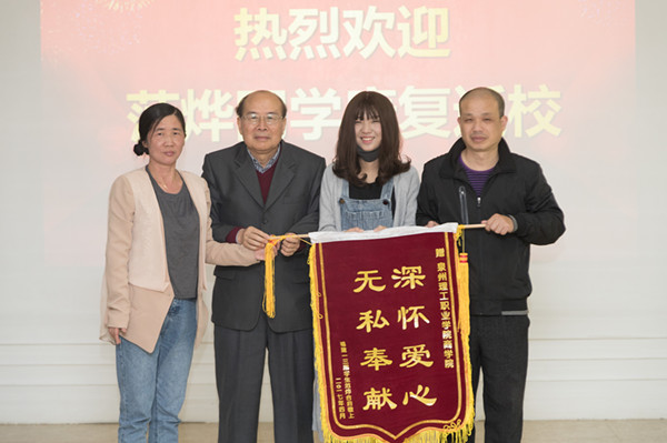 “这个世界美到想要长命百岁”曾经这句话,让多少人动容。范烨,是泉州理工学院13级会计专业学生,22岁的那年,不幸得了重症再生障碍性贫血,原本应该在阳光下奔跑,挥洒着青春的她,却痛苦的与病魔斗争着,多次与死神擦肩而过,在学校师生、校友及社会爱心人士的帮助下,范烨做了骨髓移植手术,并康复出院。昨日,范烨与爸爸妈妈一同来到了学校,领取了她梦寐以求的毕业证书,并为学校送来了锦旗与感谢信。感谢在她身患重病时,学校师生、广大校友对她的帮助。