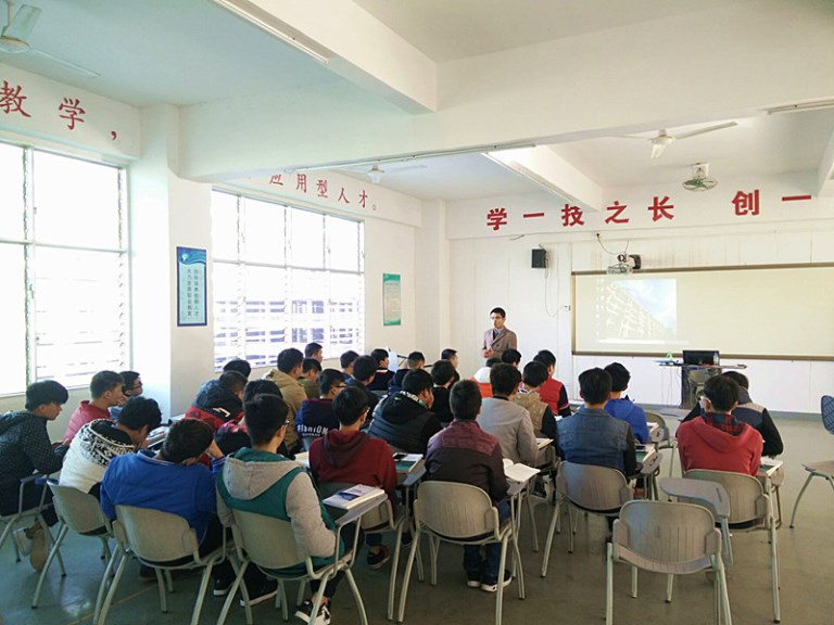 在工学院423实训室内,教学设备摆放整齐,教室宽敞明亮。15汽车2班的同学们,在陈金伟老师的指导下,正学习着汽车构建理论课,在教室内,同学们踊跃提问,老师一一解答,师生互动频繁,课堂充满活力。