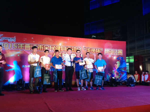 网球比赛颁奖典礼在宝龙广场隆重举行。晋江市副市长史思泉、晋江市文体新局书记陈茂和、晋江市青商会副会长蔡小强等出席仪式,我校董事长吴金营以及其他参赛运动员参加颁奖典礼。
