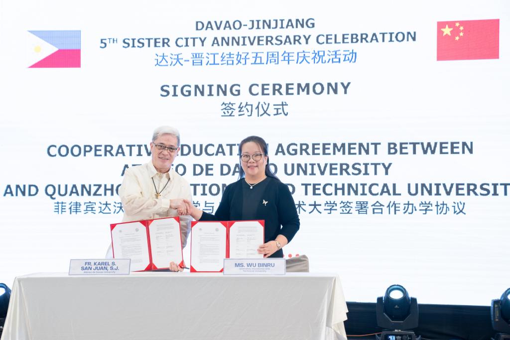 9月28日下午,“中国晋江-菲律宾达沃结好五周年庆祝活动”在达沃隆重举行。福建省委副书记、省长赵龙,泉州市委副书记、市长蔡战胜,泉州市委常委、晋江市委书记张文贤等领导率福建经贸代表团,中国驻达沃总领事赵秀珍女士、达沃市政府官员、在菲侨领、华商代表等共襄盛会。会上,泉州职业技术大学与菲律宾达沃雅典耀大学正式签署合作办学协议。