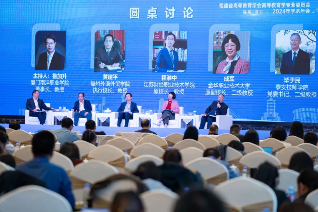 圆桌讨论环节,由厦门南洋职业学院董事长鲁加升教授主持,福州外语外贸学院执行校长黄建平教授、江苏财经职业技术学院原校长程淮中教授、金华职业技术大学原副校长成军教授、泰安技师学院党委书记毕于民教授等4位嘉宾,围绕“数智化与高等教育变革·挑战、前景与策略”的主题发表见解。