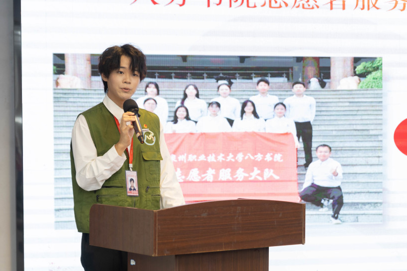 优秀志愿者代表沈文从成为一名志愿者的契机及志愿服务经历展开描述,表达了志愿服务经历对自身产生的积极影响,表示自己作为青年一辈将不断秉承“奉献、友爱、互助、进步”的志愿精神,积极参与志愿活动,奉献青春力量。