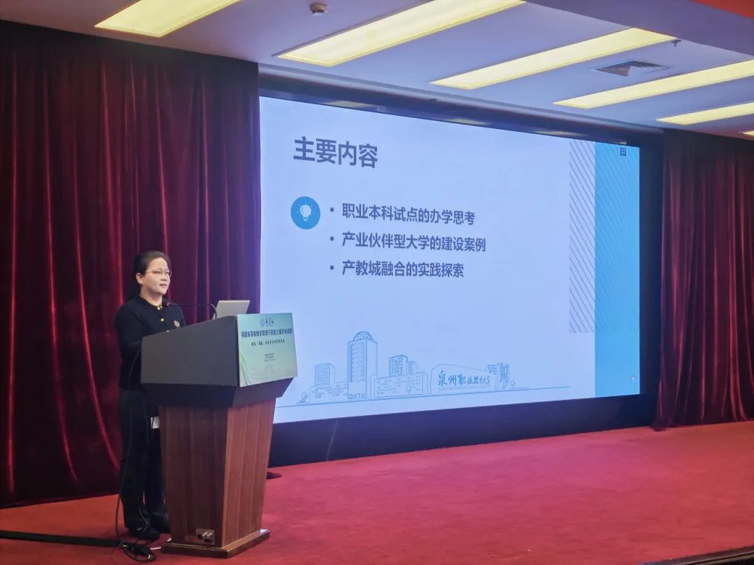 吴滨如研究员以“基于‘产业伙伴型大学’的职业本科办学模式探索与实践”为题,分享了职业本科试点的发展历程以及当前的关键任务,并以泉州职业技术大学围绕建设“产业伙伴型大学”这一办学目标展开的生动办学实践为例,分享了学校以产定教、助产高端、与产共荣的3个省级产业学院建设案例,以及学校扎实推进产教城融合、牵头建设晋江市域产教联合体的实践探索。她指出,职业教育是距离产业最近的一种教育形式,职业教育高质量发展与城市、产业的繁荣密不可分,推进产教城融合是职业院校扎根地方的法宝;发挥产业伙伴型大学的教育内驱力和市域产教联合体的教育外驱力,打造双轮驱动的职业本科办学模式,助力产业高质量发展的同时,提高职业本科院校的社会服务能力和区域影响力。
