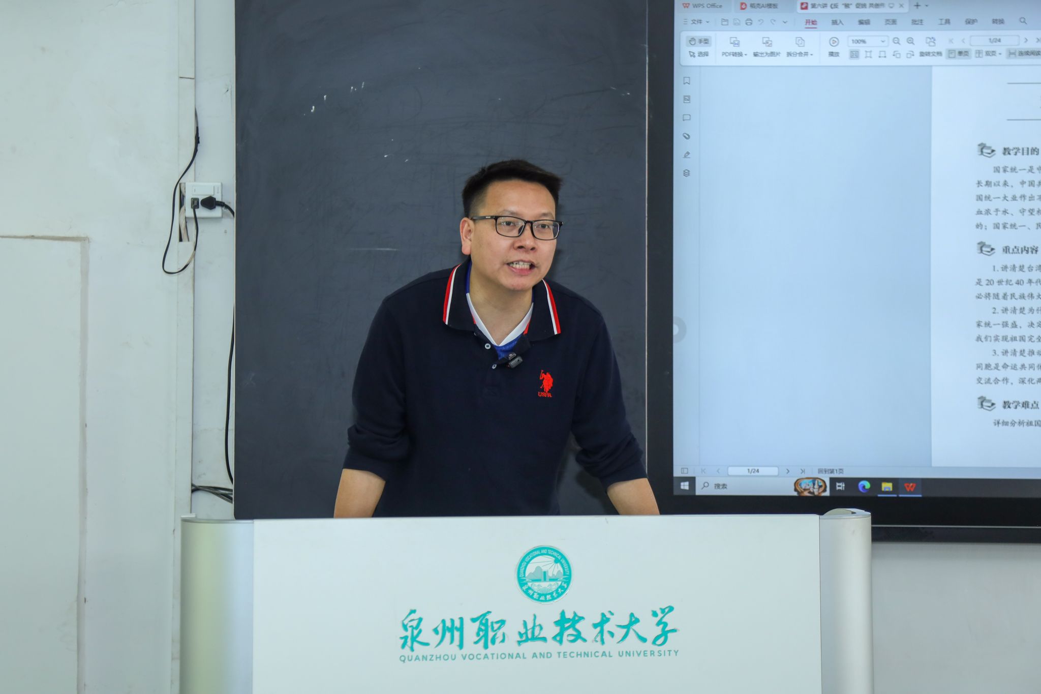 课堂上,林文艺从历史定论、法理基础、民心支撑三个核心维度出发,系统梳理了祖国统一的历史逻辑与法理依据。他结合两岸经贸往来、惠台政策落地、闽台文化交融等鲜活案例,深入阐释“反独促统”的时代内涵与实践要求,引导同学们深刻认识到:一个中国原则不容动摇,祖国完全统一是大势所趋、民心所向。